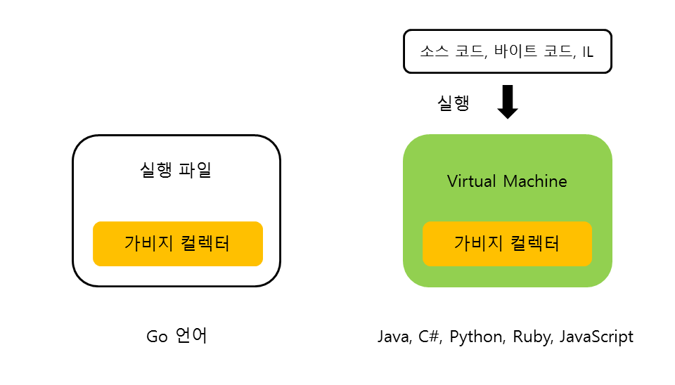 Go 의 경우에는 실행파일 안에 가비지 컬렉터가 내장된다.