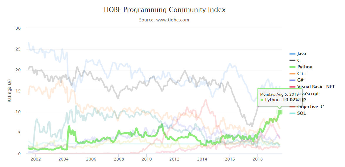 파이썬이 이제 C++보다 사용 빈도가 높군요. 10%로 자그마치 3위입니다!!