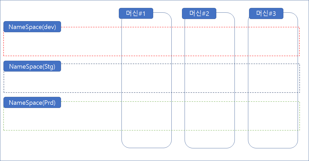 이처럼, 쿠버네티스 클러스터를 dev/stg/prd 세 개의 네임스페이스로 구분한 겁니다.